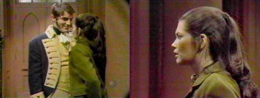 backing her into one of the columns, which she rebuffs, eventually slapping him across the face. You're engaged to Maggie Evans, my best friend! she accuses. He only knows a scullery maid named Maggie, says Nathan, and she knew her way to a man's heart, for sure. He guesses that she's Millicent Collins, newly-arrived for the wedding, and when Vicki asks WHAT wedding, Forbes tells her Barnabas Collins is marrying the beautiful, rich Josette duPres. HUH? Josette came there to marry Jeremiah, Vicki muses to herself, so this MUST be a dream. Aloud, she says, agitated, if it's a dream, why can't I wake up? If it's not, what is it--"Why doesn't anyone know me?" Forbes isn't thrilled at being slapped, and regards her coldly.