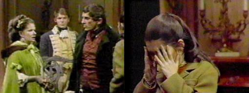 A woman who looks like Liz Stoddard (and what a magnificent gown she wears!) enters. Vicki wonders aloud if she's going mad, and the kind woman, who introduces herself as Naomi Collins, urges Vicki to sit down. She'll get a doctor for her, she promises, and asks about Vicki's carriage ride from Boston. Since Vicki took such a trip back in 1967, she wisely mentions she and David took a bus there and flew back, which makes Naomi suggest to Nathan, "The child obviously has a fever." She asks Nathan to read aloud one of the wedding invitation he picked up in town for her--"We request the honour of your presence. . .wedding of Barnabas Collins to Josette duPres on December 20, 1795. . ." Hearing the date, Vicki says, "That's impossible! I must be dreaming!" Josette married Jeremiah! Vicki tries to induce herself to awaken from this, and Naomi, probably suspecting the new governess has gone mad, gazes at her, alarmed. Barnabas comes in and tells Forbes and his mother that the carriage carrying the new governess overturned--three people were killed and the governess is missing! That might explain the way Vicki is behaving, suggests Naomi,