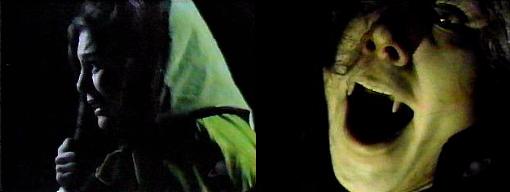 Widows' Hill - It's storming violently.  Waves greedily lap at the shore. I've come to you, calls Josette, where are you? Angelique's voice fills the air with cruel laughter. The wind blows Josette's cape. Who's here? asks Josette. Don't worry, your precious Barnabas will be here soon, promises Angelique mockingly. Recognizing the voice, Josette asks, "Where are you?"  You won't be able to see me, says Angelique--I have come to warn you, you must not go away with Barnabas--he is evil!  Barnabas loves me protests Josette. He's going to kill you, warns Angelique, and after you're dead, he will bring you back to life, turn you into a bloodthirsty animal!  No! cries Josette, stop it!  Look out over the cliff, says Angelique, see yourself how you will be after you become his. I won't look! wails Josette.  You can't resists, says Ang--go on, Josette, look into the future--see how you will change! Josette views the horrible vision of herself as a vampire, mouth open, sharp fangs exposed, hair a mess, face cruel.  Take it away, begs Josette, please, I can't look at it, take it away.