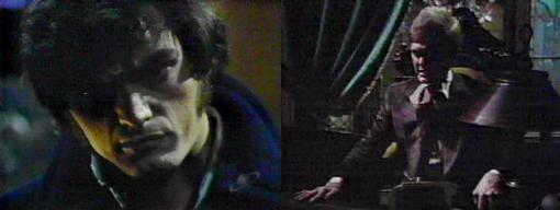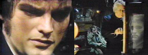 919/20/21 - Chris stares into the dead eyes of the fake head of Tate (they did show Roger Davis' real head, and that looked very creepy, but the dummy head just looked...dumb). This isn't real, says Chris, stepping forward and affixing the dummy's head to the dummy's body. "All right, I know you're in here," says Chris--I'm not leaving until I find you.  He searches the room, finally finding the real Tate sobbing behind a curtain (a comparison of this whole business to WIZARD OF OZ is inevitable). This man is ancient, his face a mass of craggy hills and valleys.  Tate died years ago, he tells Chris--because *I* killed him when he got old and ugly, and I made a new Tate who was young and handsome--and now, he says, gazing at the "dead" dummy and taking the head into his arms, "He's gone, too."  Tate sobs.  No one is gone, says Chris--this thing is a creation, and you know it. My creation--and you destroyed him--you destroyed him! cries Tate--why did I let you in?--go away!  I can't--not yet, says Chris.  I have jewels and money, offers Tate.  I don't want your money, says Chris--I want you to paint my portrait, the way you did Quentin's--I know about that, about how it solved for Quentin the awful agony of the full moon! Then you're a...begins Tate. That's right, I'm a werewolf, admits Chris, who grabs Tate's lapels and gets right in his face--and you're going to start painting right now and not stop until you finish. I can't paint anything, protests Tate softly, if I'm imprisoned. He releases himself from Chris' grasp. Chris apologizes--I've been searching for an answer for so long, I'm desperate. I know that, says Tate, but I'm no answer. Not true, says Chris.  I can paint, but it won't help you, insists Tate--that was before, many years ago, there was a power, a force. I don't believe that, insists Chris.  Only because you don't want to, says Tate--everything I've told you is true--you can leave this house, leave now, says Tate, or I'll set my dogs on him. You've got to try, begs Chris. I can't paint and I'm not going to, says Tate. And I told you you ARE, insists Chris, grabbing him away from what looks like an old intercom on the wall--is it used to call somebody in the house, or your dogs--whatever it is, it won't work until you do that painting--and Chris yanks the wires out, rendering it useless. I'm not going to pain, says Tate again. I'll see about that, says Chris--give me the key to the room!  I don't have one, says Tate. A man like you has keys to everything, says Chris--now give me the key to this room!  Tate shuffles over to the desk where his dummy still sits, and hands the key over to Chris, who closes and locks the door. Tate holds the dummy head, sobbing as if someone had really died. Get out your canvas and paints, demands Chris. No, I don't have to help you, says Tate--nothing can make me do what you want. Not true, says Chris; you've been in this room for a long time with no concept of day or night, but they still exist, and there's going to be a full moon tonight--and you aren't going to leave this room tonight until you do my portrait! Chris waves the key and warns, "If I were you, I'd finish it before the moon is up." Realizing the predicament he's in, Tate reconsiders.