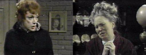 This catches Barnabas off-guard, but he recovers--it's only natural for you to be concerned, he says, and I'm also concerned for Carolyn's future. Megan, noticing something odd about his response, his behavior, watches him closely. I'm glad to hear that, says Liz. Megan comes over and asks Barnabas, are you feeling well? I feel fine, he says, but she still looks perplexed. Carolyn enters, apologizing to Megan for taking so long--I was on the phone. Megan wipes her eyes and says, we needed to be interrupted--all I can talk about now is Michael. That's to be expected, says Carolyn, taking her hand. I don't know how I will live without him, laments Megan. You have to, says Carolyn. (duh!) I know, admits Megan. You two are much better off out of the antique shop tonight, remarks Carolyn. At that moment, Barnabas spots Paul coming downstairs and exchanges glances with him before closing the doors. Liz calls to Barnabas--who's in the foyer? Barnabas doesn't respond at first, then closes the doors and says no one, I was just looking at the time. (How, given where the clock is?) Paul opens Megan's pocketbook, which is lying on the foyer table, and steals the keys to the shop. In the drawing room, Carolyn suggests to Liz--Philip and Megan stay the night. We can't, says Megan--we have to return to the shop right after dinner--but thanks for the consideration.