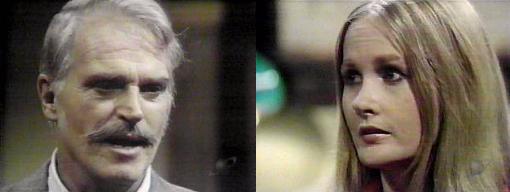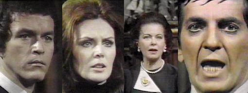 I think you're very fortunate to be the ones guiding the child, Liz tells Philip and Megan. We feel very grateful for that, Megan assures her. Philip agrees. Megan, sounding like a religious fanatic on a tear, says this crisis has been a very good test for us--the time isn't far off when our people will become a group, come into our own, there will be many more responsibilities then, and we must be prepared to meet them--when the time is right, our people, from various parts of the world, will converge here, right here, we will establish our own society right here in Collinwood--that's one of the reasons YOU were chosen, Mrs. Stoddard! Liz looks delighted--Barnabas told me that the Collins family prestige and money will be very helpful to us, but, says Liz, that's all he told us. "What more do you need to know, Elizabeth?" asks Barnabas, joining them. Liz goes to him, welcoming him--I was hoping you'd drop by this evening. I'm glad, says Barnabas--your curiosity seems to be nagging at you. He closes the double doors. No, she says, I just want to know exactly what our ambition is. We are waiting for HIM, says Megan. And what do we hope to accomplish, after he arrives? asks Liz. We must be prepared for whatever is in store for us, says Megan. Well said, praises Barnabas. I only asked because I've been thinking about the future, says Liz--I'm starting a new life, but part of the old life is still very dear to me--specifically, Carolyn. Megan, confused, stares at Philip. "What about Carolyn?" asks Barnabas. I've been worried about what's to become of her, says Liz. Don't worry about her, says Barnabas. I want my daughter to share this experience with me, says Liz--I want her to become one of us.