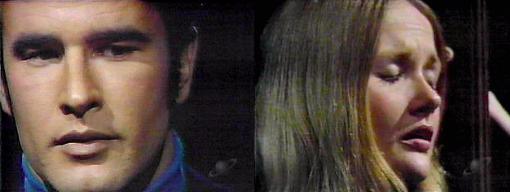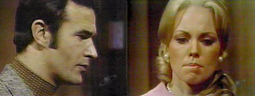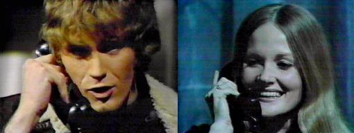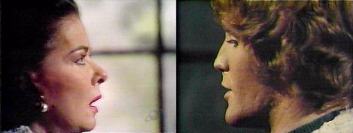 --today when Barnabas came to the house to pick up Carolyn, I noticed your nervousness again. I was upset about what happened last night, insists Angelique. It was Barnabas, says Sky, and has something to do with why you brought those people into our house... I told you, says Ang impatiently, Carolyn's father just died, she had to get away from there, she's been under a terrible emotional strain. She was fine when I talked to her last night, says Sky, and again this morning--now why did Barnabas pick her up, she's old enough to get back by herself? He was just concerned about her, says Ang. I'm concerned about US, shoots back Sky. You needn't be, assures Ang. We promised there wouldn't be lies and secrets, he says. There haven't been any, she says. Then what you told me about the guests in the house, says Sky--Carolyn was brought here for no other reason...? Angelique doesn't answer. All I want is a simple yes or no, says Sky--look at me and tell me. I have never kept any secret from you that concerned the two of us, she says--you've got to believe that. Then there was some other reason Carolyn Stoddard was here, says Sky. Yes, there was, but please don't ask what, she says. If that's how she's going to be, says Sky, we will change the rules of the game (marriage is a game?)--it's obvious that secrets are now allowed. "Sky!" she protests, flying over to sit by his knee--"They're gone! We're not involved with them anymore." I wasn't involved, he retorts, you were, and I'm sorry you don't trust me enough to tell me what happened here. I do trust you, she says, smiling desperately, upset. Tell me, let's clear the air, says Sky--go back to rule number one--no more secrets. Angelique looks at him, then turns her head away. We'll do it your way, he says coldly, I have some calls to make. She stops him as he's walking out. All right, I'll tell you everything I know, she agrees--Barnabas brought Carolyn here because her life was in danger, from the Leviathans, terribly dangerous, completely evil creatures--and they mean to start a whole new society--for a long time, Barnabas was associated with them, but has now become their most dedicated enemy (God, Ang, you were responsible the first time, and now, here we go again)! He means to use every power he has to stop them. Sky listens eagerly.