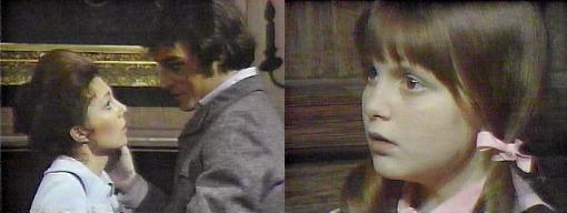 Maggie, fearful, leans her head on the bedpost. Maggie? Amy calls.  Maggie, glad she's being freed, says, unlock the door--there's been a terrible misunderstanding--I'm locked in here--please, unlock the door. I can't do that, says Amy. You must, insists Maggie, please. Only Jeb can, says Amy--he's coming now. Amy, begs Maggie, please remember we've been friends, don't leave me here, please, don't let Jeb come here!  Amy passes right by Willie, who is hiding behind the chimney. Maggie hears the door being unlocked and assumes it's Jeb, but it's Willie. Maggie runs into his arms and he hugs her, saying something I can't hear (too many bad chicks around here?), asking, what's going on around here?--but at that moment, Amy closes both of them in the tower room. Willie tries to force the door open, insisting, "It's a trap!"  On the other side of the door, Amy grins, the creepiest, most self-satisfied damn smile I've ever seen (the lighting on her in this scene is amazing). Willie turns to Maggie--that kid did this, he says.  Upset, Maggie cries, please help me out of here, now I've gotten you involved in this. She sits on the bed and begins to cry.  Willie sits beside her, holds her, begs her not to--we'll get out of this--Willie will figure something out--I always do, don't I?