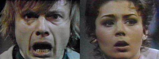 Tower hallway - Julia walks, looking around. Jeb grabs her from behind--tell me where Barnabas' coffin is! he demands. No! she gasps, trying to pry his arm from around her throat. I'll kill you if you don't, he threatens.  There's a weird, high-pitched sound, as if from outer space.  Jeb releases Julia--stay away from me! he cries--and flees.  Julia asks, "Who are you? What do you want?"  What sounds like a teakettle fills the air as she faces the unknown entity.