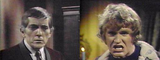 Jeb smiles at them.  What do you want? asks Barnabas. To see you, alone, says Jeb. Julia refuses to leave: No, Barnabas!  I didn't bring any silver bullets, Jeb assures them--Barnabas will be safe--for the moment.  Go, Julia, says Barnabas.  I suggest you look in on Maggie--Doctor? says Jeb.  Facing Barnabas directly, Jeb says, you won't be able to save her, anymore than you can save yourself.  If that's all you came here to say, please go! thunders Barnabas. That's not all, says Jeb--I made a mistake with you, turning you into a vampire, childish of me. Nicholas Blair told you that, I'm sure, says Barn. Yes, says Jeb, but you made a lot of mistakes, too, like burning down the antique shop--and making Maggie a spy was another. Forget Maggie Evans, orders Barnabas. NEVER! shouts Jeb--we're going to get Willie, too, that will be part of your punishment--and I want you here when I marry Carolyn--right here in this room! (Another change of venue for the wedding?) I'm able to do ANYTHING, boasts Jeb. I shall get you before then, says Barnabas venomously. Before when? asks Jeb--work fast, because I'm gonna find where your coffin is hidden. Barnabas warns, I'll see you finished before... Before WHEN? crows Jeb--before morning? Because you may not have much more time than that. GET OUT OF HERE! roars Barn. You're responsible for what happened in that hallway, accuses Jeb--I know it was you--do you think you can use my weaknesses against me?--well you won't, because I'm GONNA GET YOU, BARNABAS! I'M GONNA GET YOU!!" (And your little dog, too!)