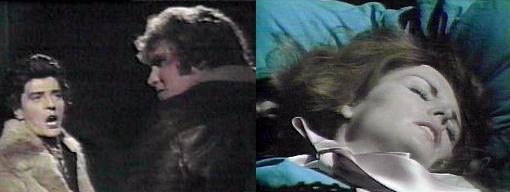 I know you were leaving to see somebody else, says Megan, but I won't let you--I won't, she says huskily, I want to be yours again. She begins untying the scarf around her throat. Please, she begs, let me... Barnabas, unable to resist this blatant, erotic invitation, sinks his fangs into her throat, and thirstily drinks. She passes out in his arms. He calls out her name like a lover. Julia enters, yelling for Barnabas in a far different tone of voice. He leads Megan over to a chair, where Julia takes her pulse. "I didn't want her to come back," says Barnabas miserably, "but she knew...she knew there was something wrong with me. Julia gazes steadily at him. "Don't look at me that way!" pleads Barnabas guiltily. Julia drops Megan's arm and rummages in her bag. Do you think I did this by choice? Barnabas asks. No, says Julia, I know you did not. Julia examines Megan. Will she be all right? Barnabas asks. "She's dead," says Julia quietly. Oh, no, says Barnabas, sinking down into a chair. If not for you, Megan would have been against us, Julia reminds him--if Jeb had told her to kill you or I, she would have done it. Barnabas, head down, orders her, don't comfort me. I'm just trying to be realistic, she assures him. I vowed that I would get every one of Jeb's followers, says Barn sadly, but I didn't mean it this way--why didn't she go back to Collinwood?--why did I panic?--perhaps I would have died and this all would have been over. It is over now, says Julia, then gulps, "For her." No, says Barnabas--don't forget what will happen to Megan. She'll become as YOU are, says Julia, horrified. Unless, says Barnabas. You must do it before she rises, says Julia. Don't you think I know that? demands Barnabas. Do you think I want her to go through the agony that I do, want her to need the blood so strongly...? Julia's face displays her sorrow as she says, you must do it, now, before she rises. Yes, Barnabas agrees, and they go over to look at Megan. I must do to her what my enemies want to see happen to me, says Barnabas--a hammer and a stake. Where can we find a stake? asks Julia. Come downstairs with me, he urges--we'll make one. They leave the deceased Megan sitting in the chair.