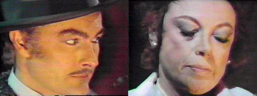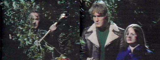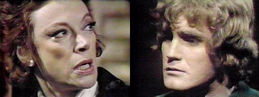You're leaving me to my own powers of deduction, he says, and grabs her arm, hurting her, dragging her away from the assortment of beakers and fluids. What is this equipment? he demands--and why is it here?--start talking!  I can't tell you, says Julia, you'll kill me.  Jeb? asks Nicholas--perhaps he didn't tell you *I* give the orders here, start talking or *I* will kill you. Jeb had me brought here and asked me to help him, admits Julia. Help him how? asks Nicholas. "You guess," snarls Julia in a delightfully husky voice. (I loved the way she said that!) Of course, he wants you to help him remain in his human form, Nicholas. Julia confesses he's correct. I don't know which of you--Jeb or Julia--is the greater fool--did you really believe you could help rid him of his true form? I told him I would try, says Julia. I'm glad I happened by, says Nicholas, because I believe your quaint little experiment is about to come to an end.  Blair knocks all the equipment to the floor as Julia cries out in protest.