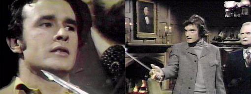 Collinwood - Quentin and Roger fret. Quentin paces--we're wasting time, he complains. We have no plan, insists Roger.  I want to go to the cemetery, says Q. That's suicide, says Roger. If he isn't there, I'll go see Jeb at the carriage house, says Q. Someone knocks at the door; Roger answers. It's Sky Rumson, here to see Mrs. Stoddard. Is she expecting you? asks Roger. Quentin answers quickly, saying yes she is, show the gentleman in. Quentin is grinning. Sky enters the foyer.  Do we know each other? asks Roger.  I've met Sky, says Quentin--heard a lot about him from his wife. Tell Mrs. Stoddard I'm here, Sky asks Roger.  She'll be down shortly, says Quentin--why don't the three of us have a nice chat?  He introduces Sky to Roger and ushers him into the drawing room. Roger gives Quentin a weird look, but Quentin waves his hand in a "trust me, I know what I'm doing" gesture. I know you like art, Mr. Rumson, says Q--you might find some of the paintings enjoyable. Something is cut out here, but Sky apparently says he isn't interested.  I'm sure you can find some things fascinating, says Quentin--do you collect weapons?  No, says Sky--are you sure Mrs. Stoddard will be down shortly?  Quentin, standing by the crossed swords on the wall, yanks out one sword, knocking the lamp to the floor as he does so. It makes a loud crash, but none of the three actors seems to notice. Quentin holds the sword threateningly at Sky, and says yes, I'm sure you'd like to see both of them, that would be a treat, wouldn't it?--there's someone we would also like to see--Julia Hoffman--now where is she?  He holds the sword up to the frightened Sky's throat.