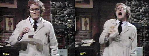 Cyrus plods down into his lab, looks out the open back door, the closes it, locking it securely. His phone rings. Looking like a man with a bad hangover, he answers, but no one is there. He hangs up, then notices his desk has been trashed. He looks through the mess, picking up and dropping a piece of paper. In his jacket pocket, he finds a mostly empty bottle of booze; his glasses lie on the floor, broken. He opens the desk drawer and takes out another pair of specs, puts them on, and reads the piece of paper he'd dropped earlier, which says, "IOU one hundred dollars." It's signed John Yaeger. Who is that? wonders Cyrus. He could be someone I met last night, after I took the compound, but I remember nothing about last night--why?--what could have gone wrong? he agonizes. He checks his jacket pockets and finds a matchbook from the Eagle Bar. A man named Paxton inquires, may I come down?--I'm from the police. Cyrus invites him down. I want to ask you some questions, says Paxton, about...last night! Cyrus gulps, unnerved. What happened?