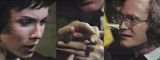 Sabrina stands in the woods, musing, this is where it all began, long ago. She enters Collinwood and wanders through the foyer and into the darkened drawing room, which now contains a table and chairs and looks ready for a seance. A black candle stands in the center of the table. Sabrina sits in one of the chairs and puts her hands down--"Our fingers must touch," she says--"the circle must not be broken--let the seance begin!"