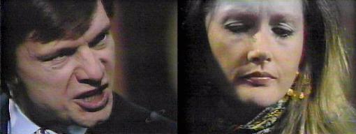 --if you have any regard at all for a man's sanity! I'm beginning to have my doubts about yours, she says. Why are you doing this to me? he demands--pretending you aren't who you are?--is it because you no longer care for me, are you trying to spare my feelings--that's impossible--if you're never to be a part of my life again, then life itself will become pointless to me--if that's it, tell me why, that's all I want from you. She turns and says, I'm beginning to feel a little sorry for you. Bruno, incensed, says, I don't want you or anyone else feeling sorry for me. You give me no choice, she insists--anger, frustration, becoming outraged, means nothing to you, and anyone who would mold his life around the belief that a loved one can return from the grave only deserves to be pitied. I believed that, he says, because you MADE me believe it! We are never made to do anything, she insists. You were something unique in my experience, you gave me reason for being, he says passionately--if you're going to tell me you're going to reject me and why, I'll believe you again, it's got to be that way, because I love you, more than I've ever loved you. I will tell you only one thing, says Alexis, and for the last time--I am NOT Angelique. I'LL NEVER ACCEPT THAT! shouts Bruno. Then you must leave here and never try to see me again, she insists. No, he protests. I will use force, if necessary, to get you out of here! she warns. Then use it, he challenges. All right, I will, says Alexis, and runs out of the room, about to cry. Bruno stands there, helpless.