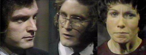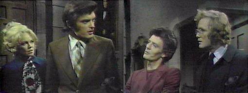 Foyer - Alexis reminds Quentin--you told me that my sister died of a stroke. She did, says Bruno, that's for sure, but she died at THIS seance--afraid? he asks--aren't you willing to go through with it? No she's not, says Quentin, answering for her. I want to answer for myself, insists Alexis. It isn't necessary, Cyrus assures her. It might be fascinating for you, counters Bruno. Quentin snarls, about to attack Bruno again, but Alexis stops him--I'm willing, she says--do you forbid it, Quentin? No, he says, I don't, but I won't participate, and after you finish, Bruno, get out of this house! Yes, agrees Bruno--this should be very interesting. (There are SEVEN people in this episode, Dan went for the big bucks!) They enter the drawing room as Quentin heads upstairs. Will Quentin allow it? asks Liz. Yes, says Bruno. Alexis sits down. That's right, says Bruno-- that's where Angelique sat, right next to Roger. Alexis grins self-consciously. Liz remarks, I never thought we'd be in this room, sitting at this table again. Cyrus will start now, says Sabrina. Yes, says Roger, let's get this over with. He lights the candle with a match. Bruno brings over an empty chair, for Quentin, noting, it's almost exactly as it was before. A storm surges outside. There was a storm that night, too, says Bruno. Alexis, says Liz, are you sure you want to go through with this? Roger asks, "Are you?" Alexis looks at the faces gathered around the table and answers, firmly, yes. We can begin, says Roger. He turns off the lights and sits down with the others. Mike R. Phone appears clearly in the shot above their heads as Cyrus informs them, our hands must touch. Six pairs of hands appear on the table, fingers touching. Cyrus calls to the spirits of the dead, humbly entreating "any of you who wish to speak to us to hear our voices--spirits of the dead, we want to know what lies beyond this life we live--hear me, hear me! If one of you can speak to us, let him use one of us as his voice, give us the knowledge we seek. The spirit who appeared to us before, in this room, the spirit who appeared when I said these words before, come now, do not be afraid, we need your help--spirit, help us save one of us, show us you watch us and you know! Sprit, come to us, come to us--now!" Sabrina begins to moan. Who are you? asks Cyrus, are you the spirit who came to us six months ago. Let me go, she begs, twisting her head back and forth. You must help us, insists Cyrus. Let me go, she implores.
