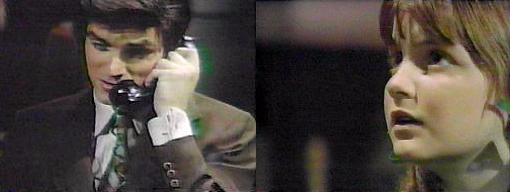 Quentin stands before the front door of Collinwood, thinking to himself, Alexis is Angelique...no, it's not possible, he argues, I don't believe Hannah and her madness--what I saw Alexis do, she explained it all--she can't be Angelique--she's dead! And yet, what I just saw--and heard--I wonder. Upon entering Collinwood, he overhears Amy on the phone, plaintively telling someone, I don't want to stay here--"I want to go and stay with you--I'm scared here!"  What's wrong? asks Quentin.  I'm talking to my brother, she says. Quentin takes the phone from her.  Amy is very upset, says Chris. I know that, says Quentin, but I have a feeling everything will be cleared up shortly--let me talk to her first, no sense her going away without a reason.