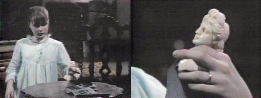 Collinwood - Angelique rises, holding herself--Amy, she says, I'm glad you realized no one was there--you can go back to bed now, right, now that you're no longer frightened? I'm not, agrees Amy. Good, says Ang, but when she goes to kiss her, has another dizzy spell. Hurrying to the door, she orders the little girl back to bed and grabs for her coat. There's something I must do, she tells the terrified Amy and disappears into the storm. Amy closes the door and looks around the foyer, telling herself aloud, I'm not afraid. She doesn't look as if she believes it, however, as she ascends the stairs and walks across the landing. Hearing a door slam, she stops a moment, but opens the door to the hallway, walks to a door and unlocks it. We see a piece of statuary covered in cobwebs.