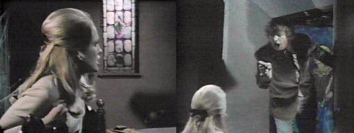 --you see, I won't betray Barnabas because I can't--don't come any closer, Angelique, please, don't. What kind of hold does he have over you that you'd be willing to give your life for him? she asks, incredulous. The wind ruffles Will's hair. Julia enters the room. Will tumbles out, not a deliberate leap, but simply a tragic accident. Angelique stares out the window at Will's fallen body; Julia stands next to her. They see him down on the patio, lying on his back, dead still. YOU MADE HIM DO IT! shrieks Angelique at Julia--"YOU'VE RUINED EVERYTHING!" Julia backs away from the furious woman--"I'm sorry, I had no idea!" Maybe he's still alive and can still tell me, suggests Angelique, hurrying from the room, Julia trailing behind her. Abruptly, Angelique turns on Julia, demanding, what were you doing up in this room, what did you come here for--what were you looking for--"ANSWER ME, HOFFMAN!" Julia, startled, says, I had a feeling you might be in danger. I was in no danger whatsoever, says Ang angrily. I suppose I must have been overanxious, admits Julia. How did you knew I was in the tower room? asks Angelique. I came looking for you, says Julia, and came to the West Wing and heard voices--I followed them and recognized your voice--then I came here. What was Will doing here? asks Julia. Probably looking for Quentin, says Angelique, rushing out. Julia glances behind her and says, "Quentin was in that room."