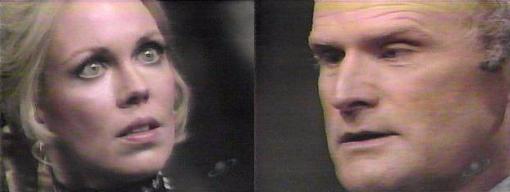 1054 - Down in the drawing room, Roger thinks to himself, I must find a way to dispose of Liz' body. Angelique spots him going upstairs and notes, I frightened you. I thought you were upstairs, he says. We should all be asleep by now, she agrees. (since when?) I was going to my room when Barnabas interrupted me, explains Roger--Barnabas was looking for Hoffman--have you seen her? No, says Angelique, with a small smile, not for a very long time. He said you'd gone upstairs with her, says Roger. Yes, says Ang, I don't think she was feeling very well--her nerves...but then we're all nervous in this house--with reason, she adds nastily.