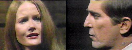Barnabas opens the doors and finds Carolyn standing before the fireplace, crying. Through tears, she says, Mother told me you were back, and it's good to see you again (not a very enthusiastic greeting). He goes over to her-why are you crying? he asks. Wiping her eyes with a tissue, she says, it's nothing you can do anything about. (I guess he forgot she's a still-recent widow.) Please tell me, he says gently. I still have trouble sleeping, explains Carolyn--I lie awake, thinking about Jeb-I can still see his face so clearly-Barnabas, she says, I don't know that I'm ever going to get over his death. You must, says Barnabas, you must. (A little more sympathy is called for here, Barn!) I thought about you often while you were away in that other time, she says--I was told that everyone there had a counterpart in that time. True, says Barn. I wanted so to be with you, she says, because I could have met Jeb there. Barnabas looks away. "You did meet him in that time, didn't you?" she asks. I met someone very much like him, says Barn, his name wasn't Jeb, but Cyrus Longworth. What kind of man was he? asks Carolyn.