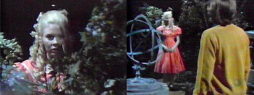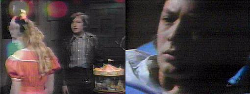 David, asleep in his bed, dreams, his head twisting back and forth on the pillow. He spots the toy carousel turning, playing its tune-on the table in Collinwood's  foyer. He comes downstairs (nice brown leather jacket, or is it vinyl). He examines the music box. A feminine hand touches his and he looks up to see Hallie dressed in an 19th century gown. What are you doing here and why are you dressed that way? he asks. She smiles shyly, mincing, but doesn't respond. Why don't you say something? he demands-aren't you going to answer me? She continues to smile, then begins to dance-alone, twirling around, moving into the drawing room. We see the carrousel superimposed on the scene now. Stop clowning around, orders David. He goes into the drawing room, asking, Hallie, where are you?, but she's disappeared. He calls her name and returns to the foyer, but the carousel is gone.