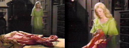 Carolyn finds Hallie in the hallway-you're supposed to be asleep, she reminds her. I was, honest, says Hallie, but I woke up and went to get a glass of water, that was all. (She really does sound like Marcia Brady.) All right, chuckles Carolyn, you go right in and get to bed. Hallie agrees, and enters her bedroom. She closes her door and sees spread over her bed the same dress David saw her wearing in his dream. She picks it up and stares at it, surprised.