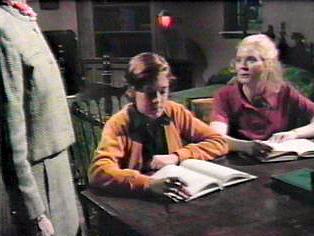 Do you want to go sailing tomorrow? asks Julia (horseback riding, sailing, they have the life, huh?) I'll talk to Maggie. She won't let us, says Hallie, she told us today, no more time away from lessons unless there's a lot of improvement. Julia, puzzled, says, I'm very sorry about that--is everything all right? Sure, says David, thumbing through the textbook. Have you noticed anything unusual going on around the house? asks Julia. I haven't, says David, have you, Hallie? No, she says--did you have anything particular in mind, Dr. Hoffman? No, I suppose I was just reacting to the eclipse, says Julia. Eclipse?  asks Hallie. Didn't Maggie tell you about it? asks Julia--there's an eclipse of the moon tonight. We forgot, says David, thanks for reminding us. Do you want to come watch it with me and Quentin? No thanks, says David, it is rather boring watching a shadow cross the moon--and it takes so long--I'd better stick to my studying. Why don't I come here later when the moon is fully gone and let you know? says Julia. That will be after midnight and we're supposed to be asleep, says Hallie. But this is something special, smiles Julia. I really think we'd better study, says Hallie. Thanks anyway, says David All right then, she says, giving them one final glance before leaving the room. David locks the door. (If I heard that door locking and I were Julia, I'd have come back knocking. Leaving those two hormone-changed teens alone in a locked bedroom together? Noooooo!)