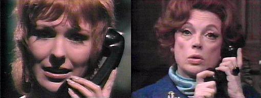 Julia (who looks fetching in a dark blue outfit with a light blue scarf and pretty pin), picks up the ringing telephone. The woman at the other end asks, is this Collinwood? Yes, replies Julia. Is Barnabas there? the woman inquires. He isn't in at the moment, says Julia, but I'm expecting him soon--who is this, please? "This is Roxanne Drew," says the woman at the other end of the phone, smiling. Julia is stupefied.