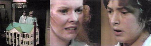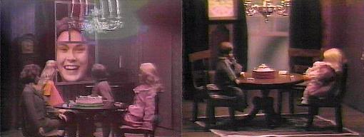 We see a small ship in a bottle on David's windowsill. He's in bed, restlessly asleep, dreaming, swiveling his head back and forth on the pillow. You'd better come on, warns Hallie, we'll be late, and I promised we would be on time--it's very important. Where are we? asks David. Rose Cottage--we've been asked to a party! she says. Rose Cottage!--I thought we'd never see it! he says excitedly. I knew we would, she tells him. What kind of party is it? asks David. A birthday party, she says. I didn't bring a present, he says--whose party is it? She enters a room where two life-size dolls sit in chairs, one with dark hair, the other blond. Oh, look, they're waiting for us! exults Hallie--what a lovely cake! Who are they? asks David. Look and see, Hallie says. He checks a place card, which has Hallie's name; she shows him the other, which has his name. But he's not me, says David. Don't ruin the party, says Hallie, we'll sit in these chairs. But that says Carrie, David says, showing her the place card. That's for me, says Hallie. And that says Tad, points out David. For you, obviously, says Hallie. Let's get out of here, says David. We can't, insists Hallie, it's Gerard's party. Gerard? asks David, who's he? Just sit down and you'll see, Hallie assures him. David sits down and looks at the dolls. What appears to be a giant-sized Daphne looks in at them through a window, laughing cruelly, a terrifying laugh. Hallie and David look at each other as her laughter fills the room.