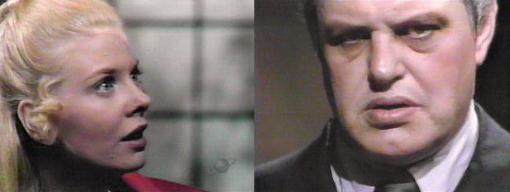 Sebastian Shaw, agitated, sits on his sofa. He grabs onto his candelabra and makes a decision. As he's about to leave, Roxanne is there, blocking his exit, when he pulls open the double doors. Going somewhere? she asks. He turns back into the room--just out for a walk, he says. You're not accustomed to taking walks at night, she reminds him, smiling--I'll tell you where you're going--your conscience has been troubling you all day about those children at Collinwood, and you decided to do something about it. Something should be done! shouts Shaw--someone should be told! "Like Mrs. Stoddard?" she suggests. Yes, he insists. Oh, you'd better think this out carefully, warns Roxanne, Mrs. Stoddard is very important to us. These children are in great danger! he reminds her. Sometime in the future, she says, maybe months from now! Or maybe tomorrow, he says. You know that's not likely, she says nastily, there would have been some sign by now--there's no reason to go hurrying off into something (she caresses his shoulder)--certainly no reason to jeopardize our position with Mrs. Stoddard. She has her arms curled possessively around his head as if for a kiss, and adds, "You do agree with me, don't you, Sebastian?" He doesn't answer, but does look very confused.