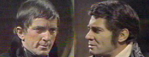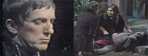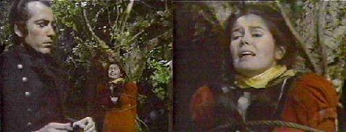 Woods - Barnabas and Jeremiah stand back to back, discussing the Duel Rules. Ten paces, turn, count to three, fire. Jeremiah tells Barnabas he never lied to him, and this one lie made them strangers. Then it's a stranger he will kill, vows Barnabas, face stony. They count the paces (I don't think they made 10, the set wasn't large enough), turn, count to three--but only Barnabas fires. Josette and Angelique come running onto the scene, Josette screaming "NOOOO!" as Barnabas' pistol goes off. Josette, the love spell back in force, kneels beside her fallen husband, sobbing. When Barnabas tries to help, she insists he back off and sends Angelique for help. "You monster! You madman!" she accuses Barnabas--"You were so full of pride, you couldn't stand to see us happy! You've killed the only man I've ever loved. I will take care of him, my husband, my life!" "He'll die without my help," says Barnabas miserably. "And you will have killed him," retorts Josette, her face set in spell-twisted fury.