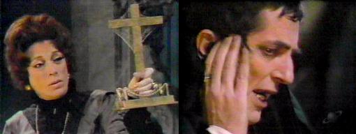 1117 - Barnabas returns to consciousness and opens his eyes. Julia grabs a cobweb-covered cross from a nearby table and holds it out as he rises to his feet. Stay away from me! she demands. With a moan, he turns away--put it away! he commands. You know I can't do that, she says. Julia, he says, you don't understand, let me look at you--I'm not the same--you saw what happened to me! You tried to kill me, Julia reminds him. Yes, and I would have, he says, if the I-Ching hadn't finally succeeded (talk about the nick of time!)