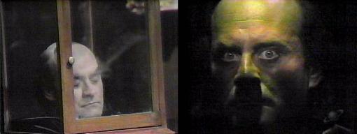 Collinwood -The house is so cold, notes Flora--the doors are open. She closes them. A man hiding behind one of the doors comes out at her; she screams. It's her son, Desmond, who greets her with a kiss on the cheek. What a way to surprise me, she chastises, you scared me half to death! Laughing, Desmond says, I have another surprise for you. Wait, she objects, you haven't even given me a chance to look at you. He stands back. Traveling is so good for you, she praises--you look so well--it's wonderful to have you back, my darling. She hugs him. It's good to be back, says Desmond, and to see you again. They go into the drawing room, where the covered surprise sits on a table. I have so much to tell you, she says. It can wait until after I show you what I brought back, he says--you've never seen anything like this in your life before--are you ready? He lifts the cover off a display case containing the severed head of an ugly man that some will say resembles Phil Collins.