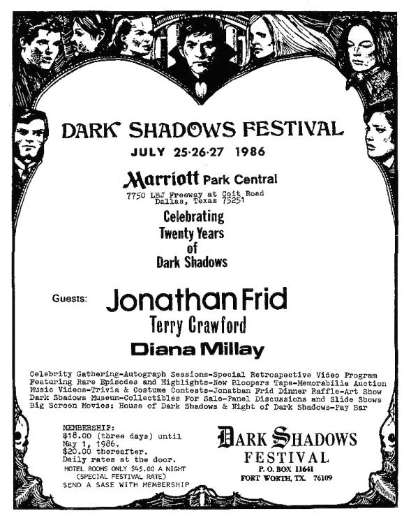 One thing I found very interesting in the Memory Book yesterday that I don't know if I even noticed before is the flyer for the very first DS Fest (in '83) says "The Collinsport Call, Inside The Old House, Shades of Grayson, ShadowGram, and The World of Dark Shadows Presents The Dark Shadows Festival". (The name "Dark Shadows Festival" is already indicated as trademarked and the Maplewood, NJ address is already in place.) That was the only year it was written that way. The second (in '84) and third (in '85) Fests say "The World Federation of Dark Shadows Clubs presents" on their flyers. But by the fourth Fest - the first Fest Pierson handled as Chairman - none of that is indicated - and has never again been indicated.