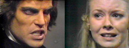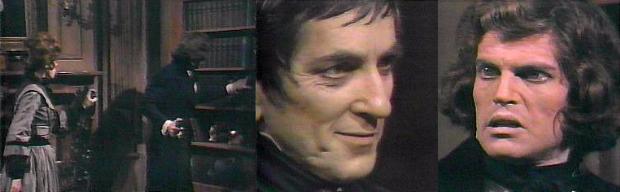 From across the room, Barnabas calls, "Gerard, looking for a book?" Barnabas! cries a horrified Gerard--it's still daylight! Of course, says Barnabas--what else did you expect at two o'clock in the afternoon?--if you'll tell me the title of the book you're looking for, perhaps I can help you find it--what did you want, Gerard?" Stiles' face twists with disbelief: How can this be?