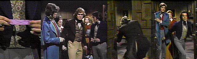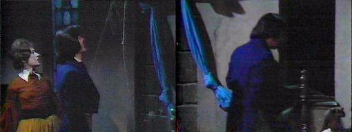 Catherine is helping Morgan on with his cloak when Julia returns--Gabriel wasn't at the Old House, she says, but Daphne saw him riding by on a horse. What is Daphne doing with Bramwell Collins? asks Morgan. Catherine reacts, too. I suppose since Daphne has had experience as a nurse, she's treating the wounds that he got during the duel, says Julia. Catherine, you must ask Daphne to come back to Collinwood, urges Morgan--Bramwell is my enemy. Be sensible, says Julia, Daphne can't come here--this place is infected with plague--you don't want to expose her to it. You were just with her, right? asks Morgan--then she's been exposed. Stop it! Catherine orders both of them--Julia's right--I've been so involved with what's happening here I didn't even think of that--you can't go into the village--if Daphne's been exposed, it's too late for her, but the good people of the village must be protected--they must. The one thing we must do is bring Gabriel back to the house to go into the room, insists Morgan--if it's the last thing I do! He leaves, exiting the front door Julia left open.