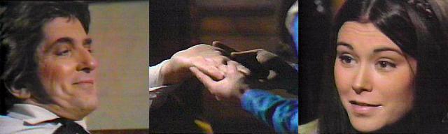 She takes it in both of hers. What do you see? he asks. It's really very nice, she says, I don't think you'll believe it because of the way you're feeling now--but all that will change. Tell me what you see, he urges. I see happiness, she says, great happiness. Impossible, he says--when? Very soon, she says. You know I don't believe you, he teases, smiling. You'll find out, she promises. Julia knocks at the door--sorry for interrupting, she says, has Gabriel been here? I saw him ride by, says Daphne. He didn't stop--why should he? asks Bramwell--there's no reason for any of you people to stop here! I know you're bitter, says Julia, and I'm sorry, but I do need your help--we held the lottery last night--Gabriel was chosen. And? asks Bramwell. He ran away, says Julia. Naturally, says Bramwell. Gabriel wouldn't do that, says Daphne. You don't know Gabriel, insists Julia. What are you doing here, Julia? asks Bramwell--what has that got to do with any of us?--you think I was helping him? (Julia looks away)--of course you did--and Morgan thought of it--I'll wager he did--well I would have helped Gabriel--you can tell Morgan that--let Morgan and Quentin draw again. More is involved than Morgan and Quentin, says Julia--we all draw. The women? asks Bramwell. Catherine? asks Daphne. Yes, says Julia. But why? demands Daphne. Because she's a Collins now, says Julia, as is Bramwell. A fact that I'm trying to forget, says Bramwell. Julia closes her eyes--I'm sorry, I don't mean to continue old quarrels, she says--but if Gabriel comes here, will you keep him here for a while and let us know?--for Catherine's sake, if no other reason (shrewd, Julia)--because we've got to find him--if we don't, we'll have to have another lottery--and next time, Catherine could be chosen.