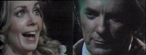 Sizzling Catherine and Bramwell get caught on the terrace, just talking. Of course, Bramwell can't help reminding her of the great time they had together, and she apparently remembers it well, too, but pretends not to. When he asked her, does your husband know that you want me to touch you right now...oh, puddle time! I gather she hasn't consummated her marriage to Morgan yet, so all she can think about, especially amidst the misery in Collinwood, is the glorious time spent with Bramwell on that brass bed.