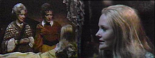 Julia tends to Melanie, applying another cold compress to her forehead. Melanie is asleep. Josette comes to visit. You shouldn't be there, warns Julia, it's too dangerous. It doesn't matter, says Josette, I wanted to see Melanie. I'd rather you hadn't come, says Julia--we would like to confine the disease to this house. Then Daphne should never have been asked to come here, should she? queries Josette, and you should never have gone to the Old House, should you? Without waiting for a response, she goes to Melanie's side and gazes down at her. How is she? asks Josette. Worse, I'm afraid, says Julia--she seems calm now, but she's been having spells of intense delirium, and her fever is quite high. Is she dying? asks Josette sadly. I don't know, admits Julia. How did this happen? asks Josette--the plague isn't heard of in these days. It wasn't, agrees Julia. And Quentin, I understand he has it too? says Josette. Yes, but not as severely, says Julia. That's a blessing, says Josette. Melanie awakens, rises to her elbows and greets Josette chirpily, calling her visit a wonderful surprise--Julia, why are you here? Melanie asks. The two older women exchange glances of consternation.