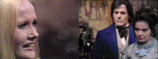 Bramwell! she says, it's so good to see you up, I didn't... Yes, Catherine? he says. You look well, she says. Thank you, he says. Do you feel it? she asks. He doesn't reply. She moves away from him. Yes, they've truly begun again, haven't they? he asks, standing behind her--how does it feel to be part of all that--you always wanted to be a Collins, now you are--how does it feel to be a part of all that madness? I'm so glad to see you--I really am, she says, but I don't think you should stay here--because of what Morgan will think if he sees us together. Why should Morgan mind? asks Bramwell--you're his wife, you chose to be his wife, didn't you? Yes, she says. Then why should Morgan mind? asks Bramwell. Because...I just think he will, that's all, says Catherine, looking down at the ground. It's a poor explanation, he says--"Good evening." He starts to go, but she calls him back, repeating, it's good to see you again, it really is. Is it? he asks. Yes, she says. I'm glad, he says--how are you? Well, she says. I mean your life, Bramwell amends--are you happy? Who can be happy in this house right now? she asks--it's impossible, with all that's happening here--but with Morgan--yes, I'm happy. (She doesn't sound as if she means it.) I don't believe you, he says. Well I'm sorry, she says. Do you wish I'd never come? he asks. She nods--yes, she says. I don't believe that, either, he says gently--are you uncomfortable with me? Of course not, she says, I'm just concerned about what Morgan will think if he sees us. Why? asks Bramwell, moving closer to her--would he know that you want me to touch you now? (ohhhh, God!) She tips her head back, probably remembering, and runs from him--I don't want you to touch me, she cries, not now, not ever again. He follows her. Are you sorry that I lived? he asks. Don't say that, she begs, clinging to the gate, breathing heavily. If Morgan had killed me in that duel, you'd never have had to go through this again, he says, but as it is, you will have to go through it over and over and over!--whether I'm here or not, you will remember, and you will long for the times we spent together. Bramwell, please don't, she pleads. Are you sorry I lived? he demands again. Of course not, she says, I wanted you to live, I wanted Morgan to live--I was against the duel from the very beginning--you know that--please, don't speak of it again. Very well, he says. She wanders to the other side of the courtyard and sits down on the bench. He stands looking down at her. How is Daphne? she asks. You've just seen her, says Bramwell, smiling with amusement, you know how she is. Catherine giggles--I don't know why I asked you that question. Don't you? he says--she's been very kind to me--he sits beside her--I needed someone, she was there--you weren't, he adds pointedly. She looks away. Does that bother you? he asks. No, she says, except that I don't think she should be there in the house with you--people would talk. Oh come now, Catherine, you don't really think that, he chides. All right, she says, I'll tell you what I think--I don't want Daphne there with you--she's young, impressionable --I don't want you to hurt her. You wouldn't be jealous, would you? he asks. For what reason does she have to be jealous? demands Morgan, interrupting them. Both Catherine and Bramwell rise to their feet. Go inside, Morgan orders his wife. Catherine assures him it's... "I said inside!" commands Morgan. Catherine goes. (I would have given Morgan my wedding ring, told him to stuff it where the sun doesn't shine, and left with Bramwell.) I told you I never ever wanted to see you here again, Morgan reminds Bramwell--now get out! You change your tone, my friend, advises Bramwell quietly--now. We fought our duel fairly and squarely, says Morgan--I won--and I chose to have you off my property now--now!--my choice may be different next time. As might mine, warns Bramwell. All right, says Morgan, then goad me--you had time to fire, didn't you?--why didn't you pull that trigger?--answer me! Bramwell looks away, then bids him good evening without answering his question. Don't you ever come back here again, Bramwell! shouts Morgan, I'm warning you--my choice might be different next time--DO YOU HEAR ME?