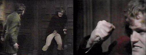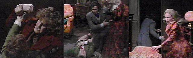 1217 - Kendrick backs away from Gabriel, accusing, "You killed my sister." One death isn't enough, says Gabriel gruffly, holding the knife in a shaking hand--one death isn't enough--there has to be more!--indeed, there's so much death in this house--and there has to be death! You're insane, says Kendrick. You're right--I've been insane for years! smiles Gabriel--I just became sane a short time ago,. Kendrick runs from him, toward the window; Gabriel pursuing him. They fight, fists flying; Kendrick kicks the knife out of Gabriel's hand. Gabriel retrieves the knife from the floor. "I'LL GET YOU!" he promises Kendrick as the two men dart and dance around each other. I'll cut you to pieces! snarls Gbriel. Morgan, standing on the stairs, hears the ruckus in the drawing room, the men screaming at each other, and races to check it out. Finding the doors locked, Morgan tries to force his way in (and the doors don't hold well anyway, as the men bang into them during their altercation). Kendrick screams, "Mr. Collins!", begging Morgan for help. Gabriel, advancing on Kendrick, says, "He can't get in, he can't get in, Mr. Young--for once, Morgan can't do a thing." Don't come closer, orders Kendrick--don't! Morgan runs to get a key. Kendrick and Gabriel get into it, battling fiercely, Gabriel once again threatening Kendrick with the knife. They grapple, Gabriel warning Kendrick you won't get away. Finally, Gabriel stabs Kendrick in the shoulder. Kendrick stumbles to his feet for a few moments, then falls. Morgan unlocks the door and finds Kendrick on the floor and Gabriel gone. He kneels beside Kendrick--where did Gabriel go? he asks. Panel, gasps Kendrick, wall, door...