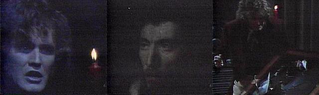 Drawing room - Quentin, rubbing his forehead, sits by the fireplace, looking through a Collins family history book. Kendrick enters. What a surprise, says Quentin--I was passing the terrace a few moments ago and saw you talking to Julia--how did you manage to ingratiate yourself with her? I didn't, says Kendrick--she tried to throw me off the grounds. Why didn't you take her advice? asks Quentin. I see you're all as hospitable as she is, notes Kendrick. We don't make the most gracious hosts, do we? asks Quentin, grinning. At least you admit it, says Kendrick. Frankly, as far as I'm concerned, you can stay here, says Quentin--I'm sure the others feel the same way--as long as you don't start asking the wrong questions-- he closes Kendrick in the drawing room, bidding him good day. Kendrick sits down on the sofa, pondering all that has gone on. The secret panel opens. Gabriel, looking much like the insane Jack Nicholson in THE SHINING, slips out. In his hand he holds a sharp knife, which he raises over the unsuspecting Kendrick, who, seeing him about to attack, leaps from the sofa to defend himself. Gabriel locks the doors. So you're back, Mr. Young, he says, with more of your questions