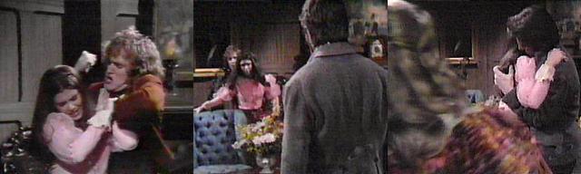 Gabriel has wandered somewhere that he's able to overhear what Daphne and Catherine are saying. I don't understand why he attacked Mr. Young, says Daphne. He's gone mad, says Catherine. I know, but how? asks Daphne, he's strange, but he's... He spent the night in that room, says Catherine. I know that, says Daphne. He didn't have to stay there the whole night, says Catherine, however, I think somehow it influenced him. You're really beginning to believe about that room, aren't you? asks Daphne. I don't want to talk about it, says Catherine. We used to talk about everything, Daphne reminds her. Catherine smiles--you're right, she says--if I'm reluctant to, it's because I don't know what I think--the thought of Morgan in there, looking for Gabriel--"I can't give in to nerves!" She rises, looking as if she's going to cry--I've got to remember that Morgan has always been able to control Gabriel--the best thing for me and you is to stay here--and wait. Julia didn't seem frightened at all when you told her about Gabriel, says Daphne. I don't think anything frightens Julia, says Catherine--except love, perhaps--except love. I really must get back to the Old House, insists Daphne--Bramwell is waiting for me, and I have to change his bandage. I told you I don't want you there taking care of him, protests Catherine. He needs me, insists Daphne. He does not! says Catherine, he's well enough to come to Collinwood. Daphne looks startled. You didn't know he came here to visit? asks Catherine--didn't he tell you? No, says Daphne. Well he did, says Catherine. And were you glad to see him? demands Daphne. I was glad to see he was alive, admits Catherine, I don't want anyone killed. Did you tell him you disapprove of my going to the Old House? asks Daphne. Of course I did, says Catherine. Why did you do that? asks Daphne, upset, it makes me sound like some sort of a child, sneaking around, doing thing she shouldn't do, and I'm not a child. You're too young for Bramwell! shouts Catherine. I didn't know it was one of your rules, says Daphne softly, that I could only see people my own age. Catherine covers her face with her hands and begins to cry--we never used to argue like this--it's just because I'm so worried about Morgan and Gabriel. Are you sure that's all it is? asks Daphne. No, admits Catherine--Daphne, are you really serious about Bramwell? Would you mind if I were? asks Daphne defiantly. It's nothing to do with me, says Catherine (yeah, right)--it's you--and the kind of life you should have. And do you know what that life is? demands Daphne. It's not living in the Old House with him, says Catherine--with his bitterness, fuming over the rich Collinses--and that bitterness, day by day, will destroy you--that bitterness is all he's got to offer you--to offer anyone. You sound like you really hate him! accuses Daphne. If I do, says Catherine, he's made me hate him--by making demands on me, interfering with my life--I never thought I'd ever speak this way about him--I loved him so, she adds sadly--but I just have no choice anymore, I have no choice--she bursts into fresh tears. Daphne tries to say something to comfort her sobbing sister, but before she can utter a coherent word, Catherine screams, "Oh, Daphne, please stay away from him--stay away from him!"--and runs out, leaving her sister sitting, upset, on the sofa.