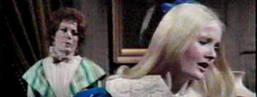5:55 - The clock strikes the half hour.  Julia joins Kendrick in the drawing room and closes the doors.  Well? he says.  Now you know, says Julia, why we have sheltered her.  What's wrong with her? he asks.  It's a question I cannot answer, says Julia, no one knows what's wrong with her.  How long has she been that way? he asks.  Ten years, replies Julia.  What's been done to help her? he demands.  Nothing can be done, she says.  I refuse to believe it, he retorts.  If it were a physical ailment, says Julia, she'd have had the finest doctors available, but it's a condition of her mind--when this happens to her, her whole personality changes and she actually becomes someone else.  I've never seen anything like it, he says, stunned--she was a totally different person!  That's exactly why I've tried to discourage you from seeing her, says Julia--will you go now?  No, I want to know more, lots more! he insists.  Can't you see how impossible the entire situation is? she asks.  I know the other Melanie, the real one, the one I care about, insists Kendrick--I will decide whether the situation is impossible or not.  There is nothing more I can tell you, she says.  You can tell me the cause and how it started! he says, sitting on the sofa beside her.  She thinks it over--Melanie was very fond of Justin, she begins--she loved him as much as if he'd been her real father--10 years ago, Justin Collins suffered a stroke--the experience sent Melanie into a state of shock--what you see now is the result (lame lie).  Are you telling me Justin Collins is the cause of her illness? asks Kendrick.  It's the only cause we can see, says Julia.  I cannot believe that, or accept it, he says--how often do these transformations occur?  No set pattern, says Julia, they just happen from time to time.  Is it possible Melanie could be under a spell? asks Kendrick.  I don't know what you're talking about, says Julia.  Then let me be more specific, he says--could Melanie be under some kind of curse?  She laughs--I believe such things only happen in fiction, says Julia.  Perhaps they do, he says, but ever since I've been in Collinsport, I've heard rumors and stories about a curse on the Collins family.  Julia shrugs-- there's always been talk of a curse, she says, but that's all it is, just talk.  The villagers don't seem to think so! shouts Kendrick--I think you should begin to take their heed seriously.  You're wrong, she says, the villagers have nothing better to do with their time than to make us the prime target of their gossip--I've told you enough now, please go, Mr. Young.  Melanie enters, back to herself.  She greets Kendrick with joy--why are you still here? she asks--I thought you went to the village.