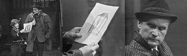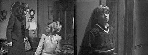 David stands in the foyer, drawing on a piece of paper. Roger comes down, coat over his arm, and asks if he's seen Miss Winters. Yes, he says. Where is she? asks Roger. How should I know? asks David. I just this minute asked if you'd seen her, says Roger, annoyed. I have, this morning when we did lessons, he says. Haven't you seen her since? asks Roger. I saw her driving out in Carolyn's car, says David. How long ago? asks Roger. I don't remember, says David. Listen carefully, says Roger--did you hear any particular place she might have gone? Yes, into town, says David. But where in town? persists Roger. She didn't say, David tells him. Roger, annoyed, puts on his hat and coat. Would you like to see a picture I was drawing? asks David. Not at the moment, says Roger, I have more important things to do. (Supportive father?) This is important, too, says David--it shows what's going to happen to the man who killed Mr. Malloy. Roger takes the picture--a hanging man.
