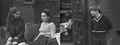 David exits the kitchen and comes to eavesdrop on the girls. So did I, says Vicki, but we were wrong. What kind of proof did you find? asks Maggie. That's not important, says Vicki, the important thing is, Bill Malloy was murdered! Is that all you know? asks Maggie. No, I think I know who killed him, says Vicki. Who? asks Maggie. I can't tell you that, says Vicki, there isn't enough evidence for a judge and jury, but there's enough for me--and there's a motive, too. I don't think you have the right to go around saying things like that, says Maggie, standing, her voice and face cold. What do you mean? asks Vicki. You know perfectly well what I mean, says Maggie. Vicki stands, too. I don't understand you, she tells Maggie. And I don't understand you, says Maggie--you pussyfoot around, pretending to be so friendly with everyone, and all you succeed in doing is stirring up trouble--as a matter of fact, all the trouble in Collinsport started the day you arrived. Burke Devlin arrived back that same day, says Vicki. That has nothing to do with it, says Maggie. At that moment, Carolyn catches David listening in and grabs his arm. Caught ya this time, didn't I! shouts Carolyn. David screams for her to let him go. What's going on out here, asks Vicki, exiting the drawing room with Maggie right behind her. I just caught him red-handed, says Carolyn, standing and listening to your conversation--it's just what he must have been doing this afternoon when we were talking about my date--then you have to go and blab everything to Uncle Roger. I did not! says David, and I wasn't listening, and I didn't tell my father anything! If I didn't feel so good, says Carolyn, still holding onto him, I could really belt you one! You wouldn't dare! he taunts. Don't tempt me, she warns him, and he wriggles out of her grasp and races into the kitchen. Come back here, orders Vicki. Let him go, says Carolyn, grabbing her coat off the foyer table--how are you, Maggie? I'm fine, replies Maggie. Carolyn twirls around, asking if she looks all right. You look lovely, says Maggie--do you have a special date? Very special, says Carolyn, grinning, and bids them good night. Ask Burke to phone me, will you? Vicki asks her--it's very important. Carolyn looks at her and repeats, sarcastically--ask Burke to call you--of course, Vicki, you know I will--good night! And Carolyn leaves. Vicki walks past a stone faced Maggie and into the drawing room.