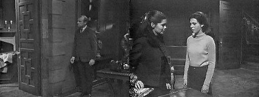 I don't know about that part of it, says Vicki, all I know is, that the murderer left a clue, and doesn't even realize it. What clue? asks Maggie. A fountain pen, replies Vicki, I found it at Lookout Point. You certainly should go see the sheriff about that, advises Maggie. I can't, says Vicki, not yet--I shouldn't even have told you. Don't worry about me, says Maggie, my lips are sealed--I just wish you'd trust me. I do, Vicki assures her, I really do, but I told you how dangerous is could be. Do you want me to stay here with you? asks Maggie. Roger returns to the kitchen. No, I'll be all right, Vicki says. I ought to get home and start dinner, says Maggie. You go ahead, says Vicki, and thanks for bringing back my bag. I still wish you'd come with me, says Maggie. I can't, says Vicki. Is it because you can't trust my Pop? asks Maggie. Oh, no, says Vicki, it's not that at all--I'm going upstairs and locking myself in my room until Mrs. Stoddard comes back. She opens the double doors and they step outside. You're braver than I am, says Maggie--still, I guess you're as safe here as you would be anywhere else. She ought to be back pretty soon, says Vicki. I thought she never left the place, says Maggie. She hasn't gone off the grounds, just to Matthew's house, says Vicki. I could call my Pop and tell him I have something to do, says Maggie. No, please don't, says Vicki. I think you're a nut, says Maggie. Maybe you're right, chuckles Vicki. Remember when we first met, reminisces Maggie, before you first came up to Collinwood, and I told you that I thought you were crazy to come here? I remember, says Vicki. Well I still think so, says Maggie. Roger leans back against the wall (where Barnabas' portrait will one day hang), lying in wait for Vicki. Bye bye, the girls say, and Vicki closes the doors. We hear a car start. Vicki wanders into the foyer.