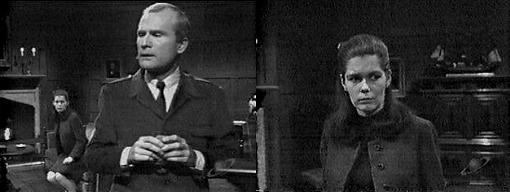 They don't hang people anymore, says Roger icily--not in this state, anyway. That's too bad, says David. Roger leaves without another word, but grimaces at his son. (Ever the sweetheart is David.) Once Roger is gone, David opens the drawing room door and calls in, "Miss Winters, you can come out now." Vicki exits the drawing room, relief on her face.