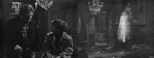 We see Josette's ghost materialize and climb down from the portrait. She stands in the middle of the room and turns to stare at her portrait.