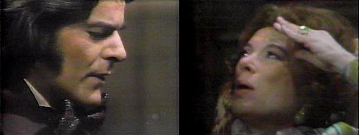 Bramwell gazes out the window of his and Daphne's bedroom. Daphne, dreaming, mutters, in delirium, you have to take me away from here...be happy... He takes her hand--Daphne! he calls. She looks at him, awake now, and says, "You're still here." "I'm not going to leave you, darling," he assures her. I was having a dream about the two of us, she says--we were going away together and start a new life. We will, he promises, as soon as you're better. It was only a dream, no more she says. Don't talk this way, he begs--we will make it work, make it happen, I swear we will! I know how much you mean that, she says, but it's too late, don't you see that? No, he says--tomorrow morning, the doctor will be here from Boston. I think I've lived most of my life on dreams, she says--I'm not like Catherine, not strong, not able to face things as she is--so instead of facing things, I dreamed--only the things I dreamed were just a little beyond my reach, and so I never saw life as it really is. What are you trying to say? he asks. I'm trying to say something I should have realized and said a long time ago--"You see life as Catherine does" (he looks down, ashamed)--"you're so much alike--and that's the reason why you belong together." You mustn't say these things, he insists, rising from the chair and walking to the foot of the bed. I've got to say them, she says, because I never meant anything more in my life--you could never be completely happy with anyone but Catherine--I should have realized that long ago. How can you blame yourself when I'm the one who's guilty? he asks sorrowfully--I cannot let you do this--if I hadn't been so blind and selfish, this never would have happened. (Bingo, Bram.) You mustn't feel that way, says Daphne, it's not your fault!--you've got to think about the future. Daphne, he says, sitting beside her, taking her hand in his, there is no future without you. Yes there will be, she assures him--there will be. No, he says, because I'll never be able to forgive myself for this. You've got nothing to forgive yourself for, she says--you've only got a responsibility to yourself--to make the best possible life you can. Not without you, my darling, he laments, not without you--he kisses her hands. I can't tell you how much I want you and Catherine to find happiness, she says. (guilt meter to the max!)