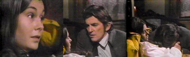1235 - Julia lies on the sofa in the Collinwood drawing room. Morgan dabs her forehead with a compress. She awakens and puts her hand to her throbbing forehead. Don't try to sit up, warns Morgan. My head, she moans. He must have given you quite a blow, guesses Morgan. Gabriel! cries Julia in horror. Yes, he locked you in the tower room, he says, I had to find another key to let you out. He's gone again? she asks fearfully. Yes, he says--what happened? He completely fooled me, she says, I took his food up to him and told him what the family's decision was--that he had to stay in the tower room a while longer--he took it very calmly--he seemed so normal, so in control. A bit too much so, suggests Morgan. He asked me to stay and talk to him, says Julia, while he ate--there was a sadness in his voice, I began to feel sorry for him.
