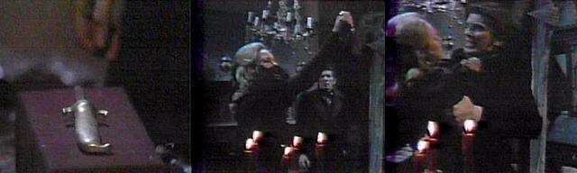 Catherine, he's trying to possess you! warns Bramwell. There is nothing anyone can do, she says. Yes there is, he insists--you can fight--you must fight! No, she says, there is only one way for us to have peace. You have the willpower! he says urgently. No, Brutus will never set us free, you know that! she says. Bramwell, his face contorted, says, I will not believe that, nor must you. First you must kill me, she says, then yourself. No, Catherine, he insists. Then if you won't do it, I shall! she declares. She finds a knife sitting on top of a small, cloth-wrapped altar. That knife wasn't here before! says Bramwell--where did it come from? Catherine picks it up and lifts it high, about to plunge it into her breast.